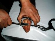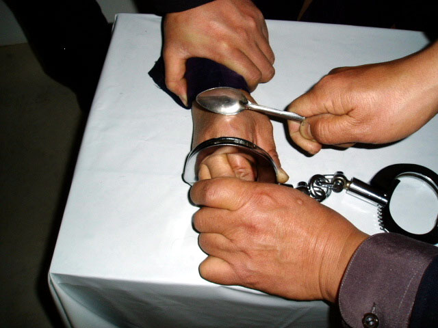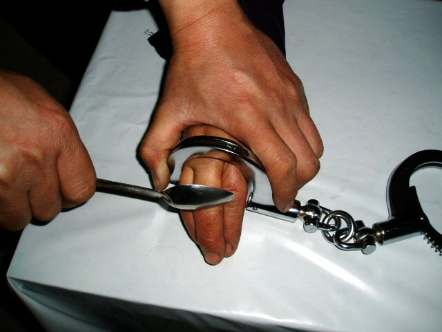 手铐硌手:用一只手铐铐在手掌上,按在桌子上,用力往下压手铐,手铐齿卡进肉里,钻心疼痛,手上留下伤疤。(图一)
